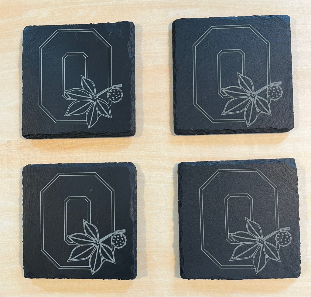 Item 1, 2, and 3 Coasters a 4″ slate with 4 rubber pads under – Each set of 4 is $20